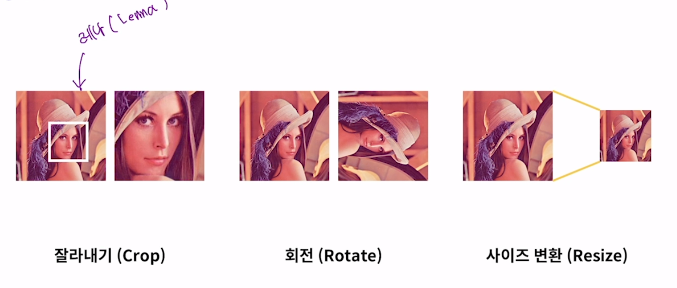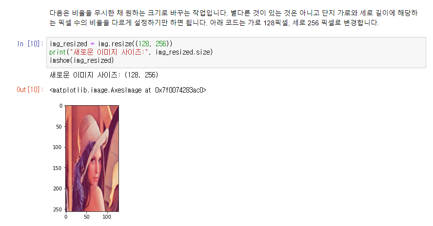 img.resize 메소드 : 크기 변환은 세로,가로 길이를 변화시키는 것이고 비율 변환은 기존의 이미지가 가지고 있던 가로와 세로 길이의 비율을 변환하는 작업. resize 혹은 rescale로 부르며 resize메소드로 통일해서 수행한다.