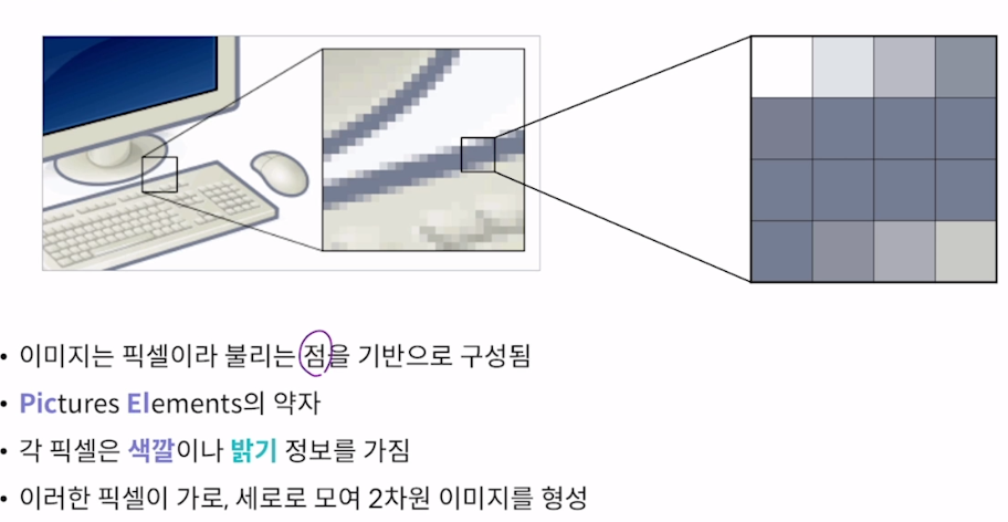 픽셀 하나당 색깔, 밝기 정보를 가진다.
