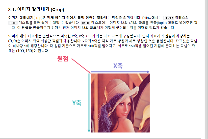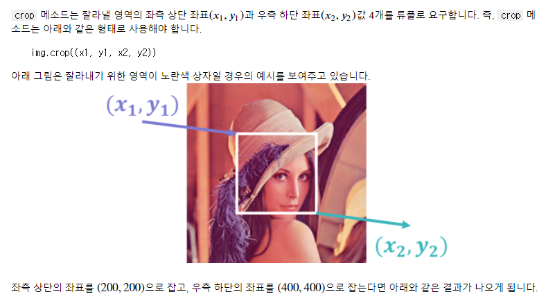 crop : 전체 이미지 안에서 특정 영역만 잘라내는 작업을 의미, Image클래스의 crop 메소드 사용