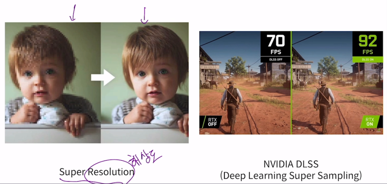 NVidia의 기술 : 일단 저해상도로 그리고(FPS가 높다), 실시간으로 딥러닝으로 고해상도로 바꾼다. 이 모든 작업을 그래픽카드 내부에 장착을 시킨다. -> FPS자체는 저해상도에서 그렸을 떄의 값을 고정하면서도 화면의 품질은 고해상도처럼 만든다.