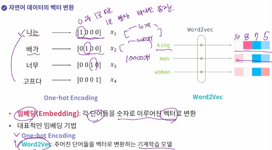 자연어 : 임베딩(one hot encoding=1이 하나만 등장한다 등)으로 각 단어를 숫자로 이루어진 벡터로 변환