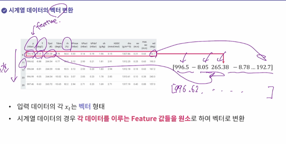 시계열 : 각 데이터를 이루는 feature값을 벡터로 변환