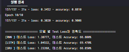 print("[RNN ] 테스트 Loss: {:.5f}, 테스트 Accuracy: {:.3f}%".format(rnn_test_loss, rnn_test_acc * 100))