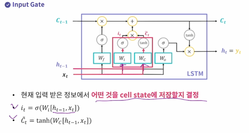 Input Gate 현재 입력받은 정보에서 어떤 것을 cell state에 저장할지 결정