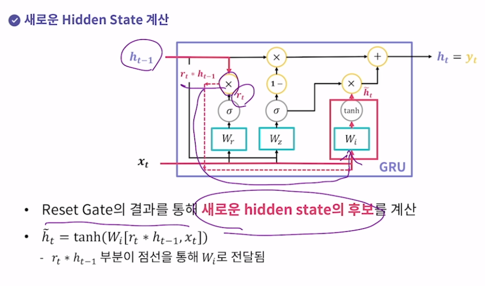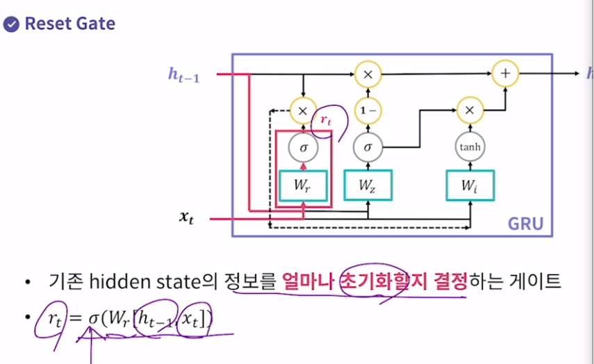 Reset Gate 기존 hidden state의 정보를 얼마나 초기화할지 결정하는 게이트