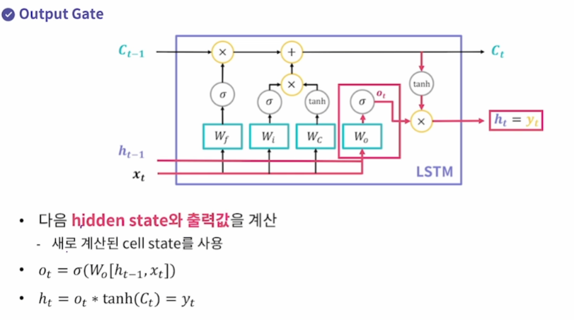 Output Gate 다음 hidden state와 출력값 계싼