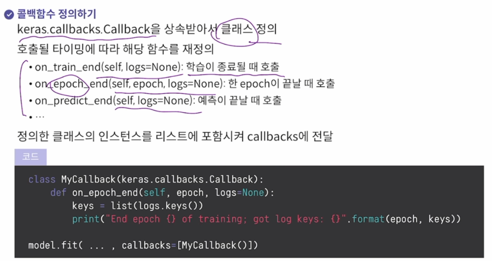 keras.callbacks.Callback클래스를 상속받아서 클래스 정의