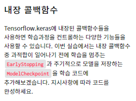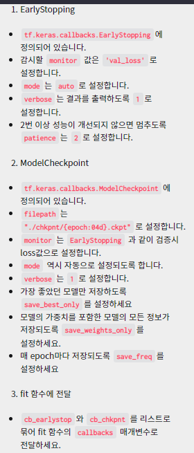 # TODO: cb_earlystop와 cb_chkpnt를 리스트로 묶어 fit 함수의 callbacks 매개변수로 전달하세요.