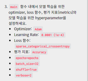 # TODO: [지시사항 3번] Optimizer, Loss 함수, Metrics과 모델 학습을 위한 hyperparameter를 완성하세요.