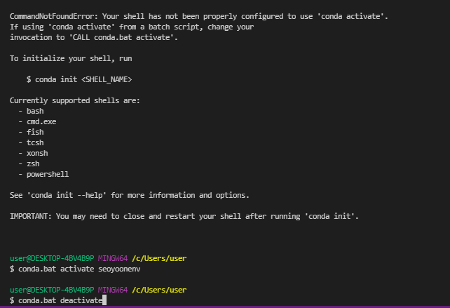 conda 가상환경에서 activate gitbash로 해봤는데 가상환경인지 로컬인지 잘 모르겠어서 그냥 powershell에서 하자