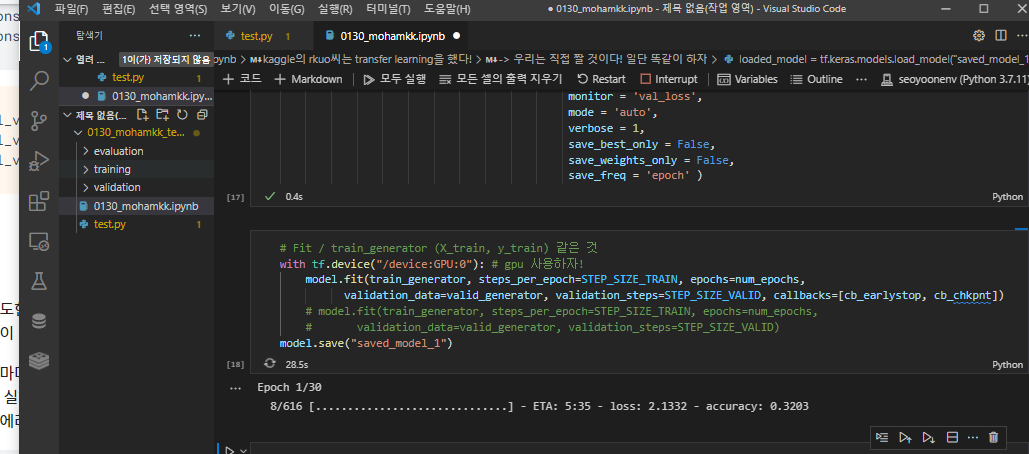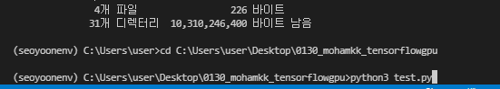 가상환경에서는 python3 말고 python으로 돌려야지 아까 깔았던 pip3 install tensorflow가 인식이 된다.