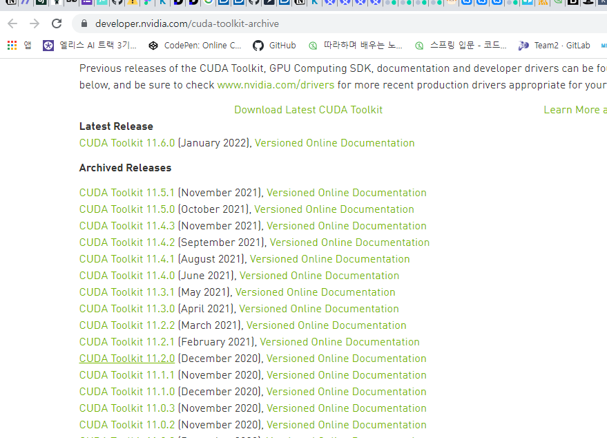 나는 GPU를 1050Ti를 사용하기 때문에 CUDA가 11.6으로 되어있었고, 호환되는 CUDA Toolkit은 11.2로 깔것이다.