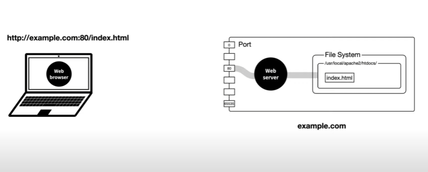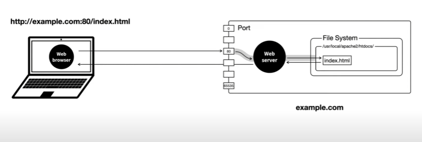 브라우저가 80번 포트로 example.com으로 들어간다. 그 다음 웹서버가 index.html파일을 찾고 그걸 웹서버가 다시 웹브라우저로 전달한다.