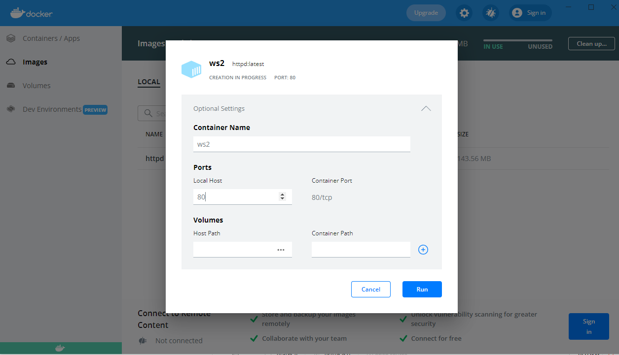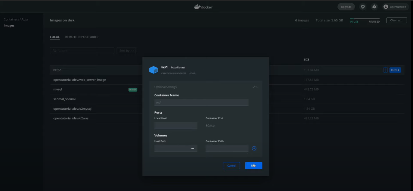 사용하고픈 이미지를 선택하고 container name을 맘대로 정해주고 run을 시킨다.