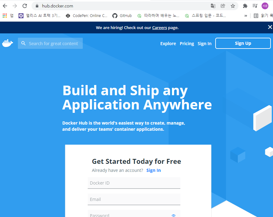 도커도 도커 허브에서 도커에서 이미지를 다운로드(pull)한다. 이미지를 실행(run) : 컨테이너