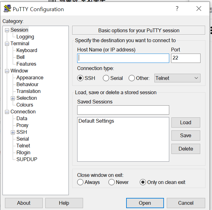 - 처음 환경설정을 저장할 때 Saved Sessions에 myserver 등 적당한 이름을 입력하고 Save를 누르면 되고, 기존에 저장되어있던 환경설정을 저장하는 경우도 해당 이름을 선택하고 Save하면 덮어씌우기가 된다.