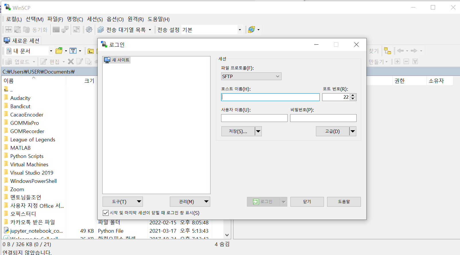 저기서 SSH를 사용할거면 파일 프로토콜을 SCP로 하면 된다. 그 외 SFTP ,FTP, Amazon S3 등에 접속하려면 그 관련 프로토콜을 선택하면 된다. SSH 표준은 22이다.