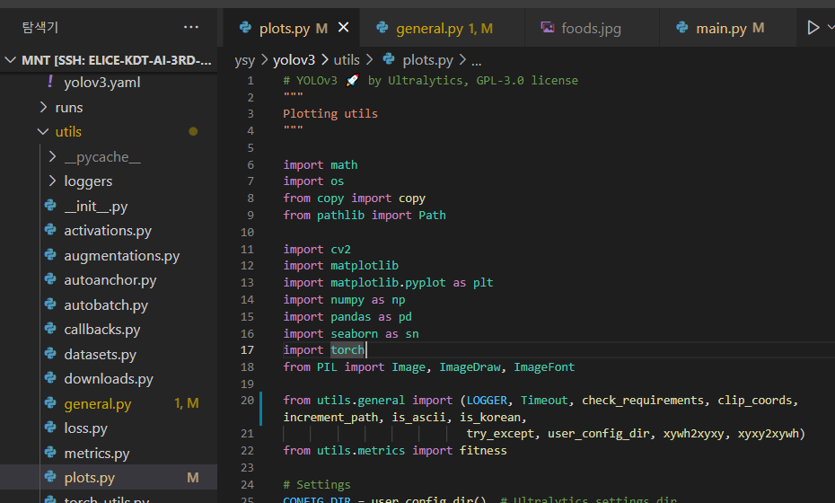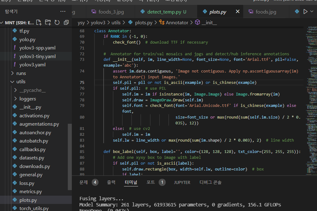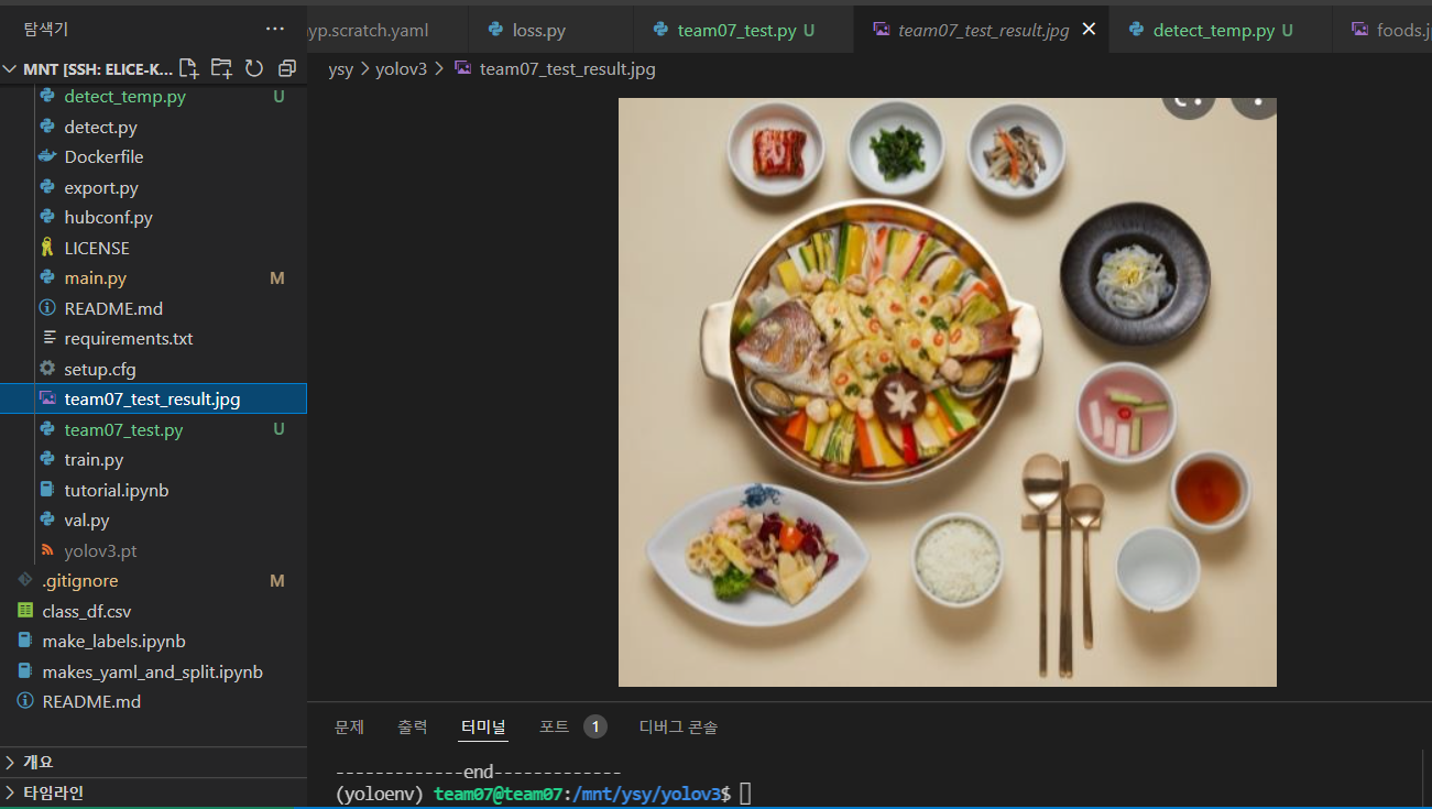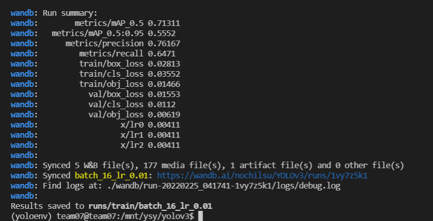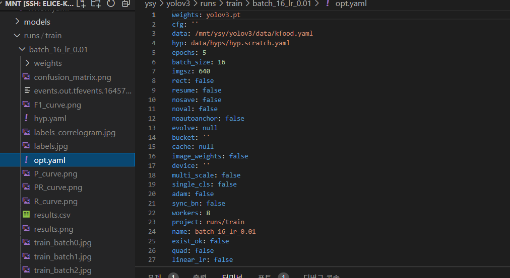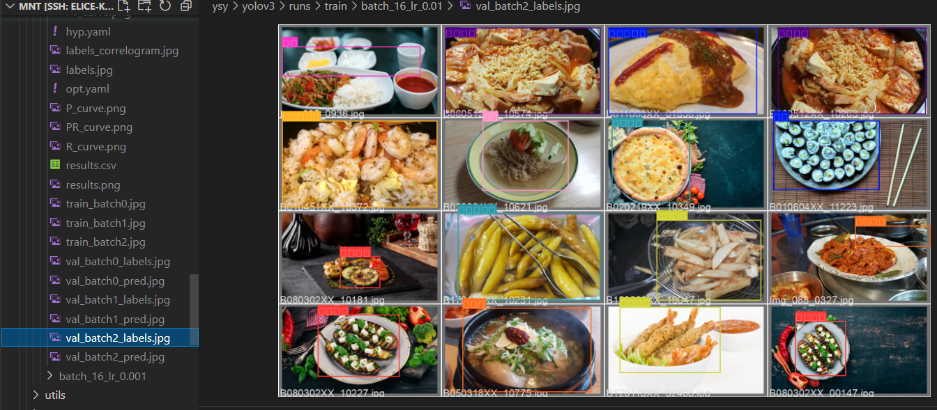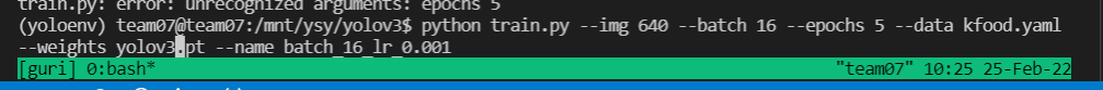 이 best_0225.pt 모델은 python train.py --img 640 --batch 16 --epochs 5 --data kfood.yaml --weights yolov3.pt --name batch_16_lr_0.01 를 돌려서 얻은 모델이다.