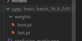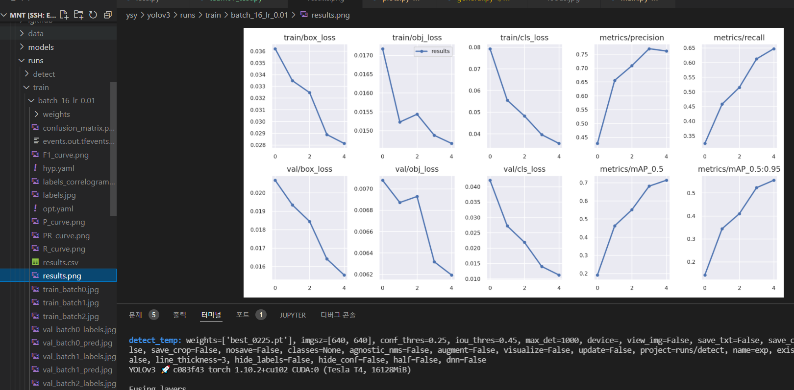 train 결과들이 저장되는 폴더이다. 모델(best, last), confusion matrix, epoch마다 loss 변화 등등