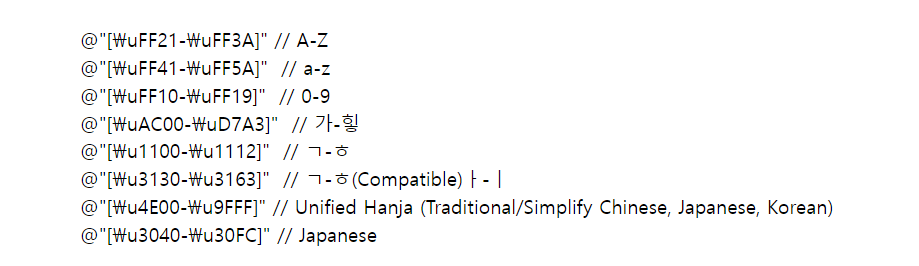 예전코드 string Pattern = @"^[a-zA-Z0-9가-힣ㄱ-ㅎㅏ-ㅣ]*$"; 한글, 숫자, 영어는 커버가 가능했지만 ...