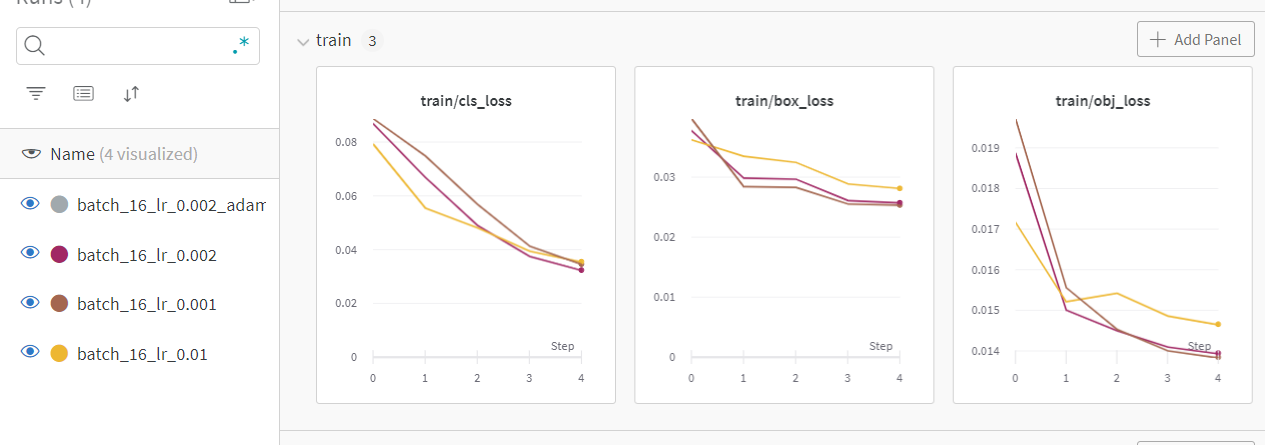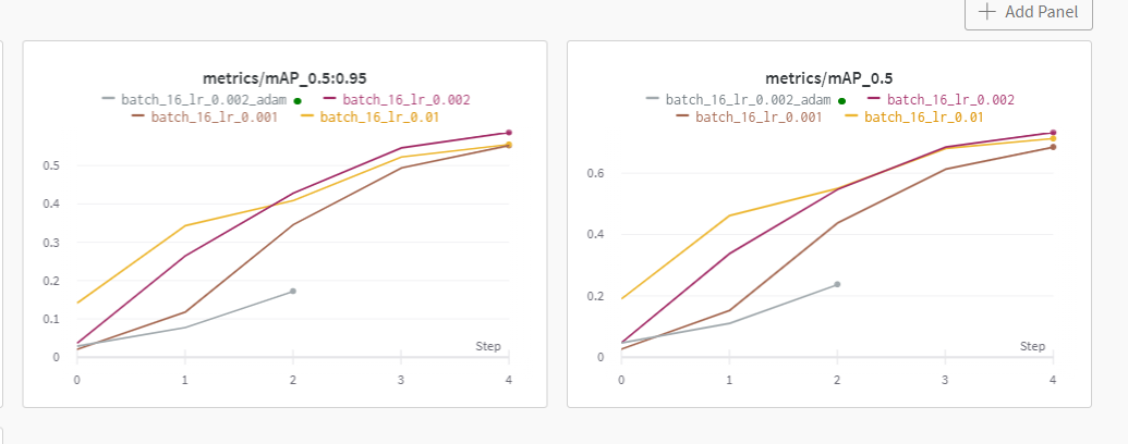우리는 recall(검출률)이 더 중요하므로 box loss와 obj loss를 중점적으로 보면 val(답을 모르는 이미지들에 대한 detect) 에서는 lr이 0.002인 경우가 제일 loss가 낮아서 좋았다.(자주색)