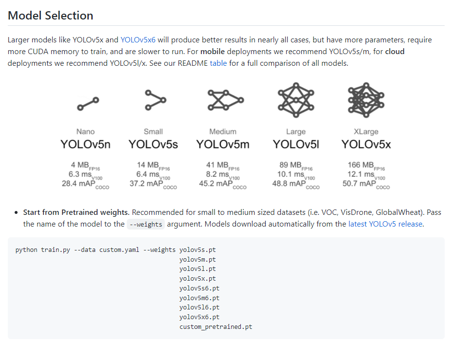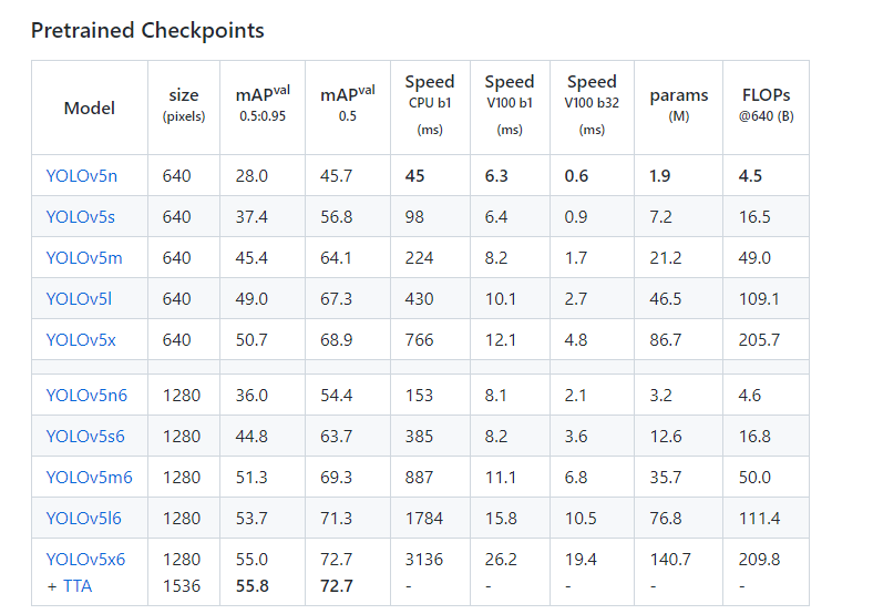 yolo v5는 v5 nano, small, medium, large, xlarge가 있고, 커질수록 용량과 inference time?이 증가하는 대신 정확도(mAP)가 향상한다. 저 뒤에 붙은 6은 더 최신버전?이라는 뜻인 것 같았다.