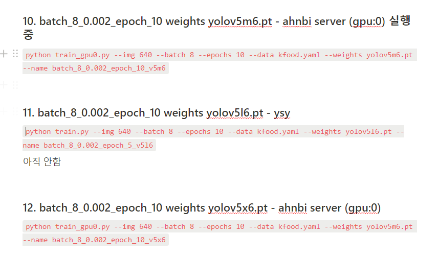 python train.py --img 640 --batch 8 --epochs 10 --data kfood.yaml --weights yolov5l6.pt --name batch_8_0.002_epoch_5_v5l6