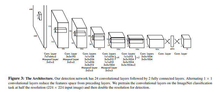 YOLO의 구조는 GoogleNet의 모델에서 영감을 받아져 짜여졌다. YOLO는 2개의 fully connected layers 뒤에 24개의 convolutional layers가 있다. GoogleNet과는 다르게 3x3 convoluational layer를 쓴 뒤에 1x1 reduction layaer를 사용한다.