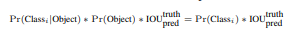 - 나중에 test를 할 때, conditional class probability와 각 box의 confidence prediction을 곱하여 각 상자에 대한 클래스별 신뢰 점수를 구한다. 이 점수는 상자에 나타나는 class의 확률과 predicted box가 얼마나 잘 맞느냐를 확인한다.