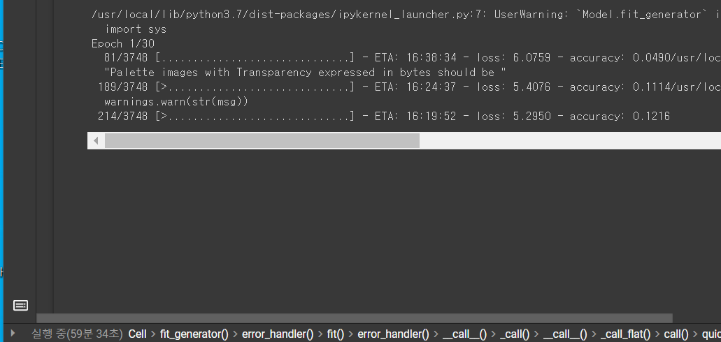 그리고 드디어 지금 엄청 오래 걸리는.. model.fit을 진행한다. keras에서는 model.fit과 model.fit_generator를 모두 제공하는데