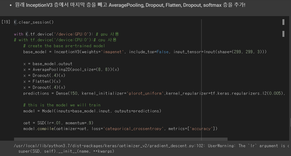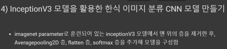 모델 수정 : InceptionV3 모델에 마지막 층을 빼고 다음과 같은 층을 추가한다.