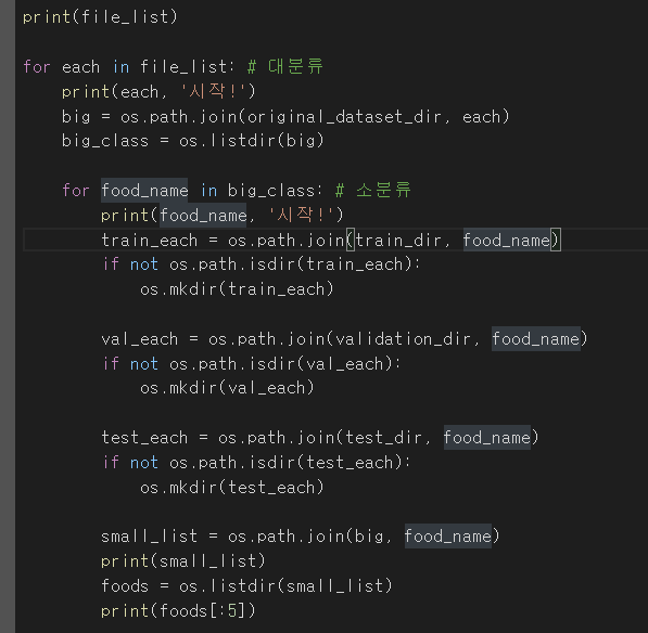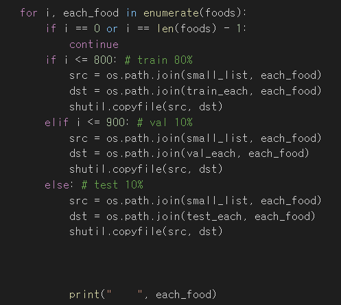 전체 데이터 폴더 kfood 를 final_food라는 폴더에 train, validation, test 로 8:1:1로 split