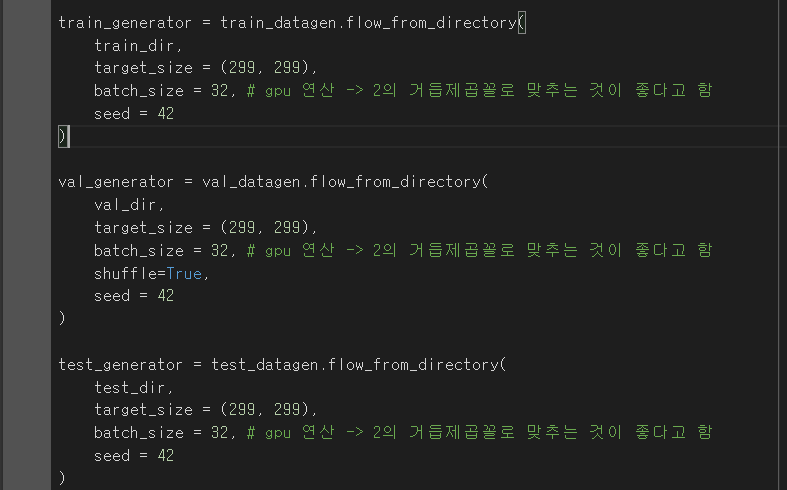 target size는 299 x 299로 정사각형이고, 이미지의 각 픽셀을 255로 나눠주는 게 되게 중요했었다.(현호님과 했었을 때 test도 255로 나눠주지 않으면 이미지 픽셀값을 너무 크게 인식해 아예 분류를 해내지 못했었다.)