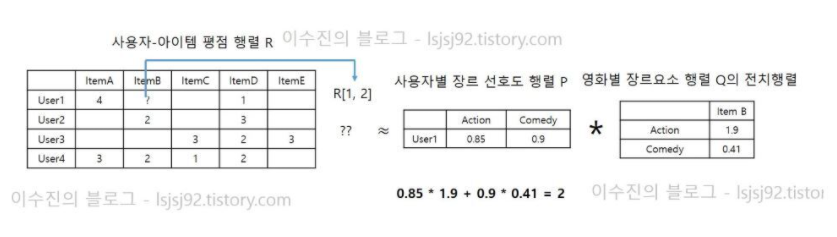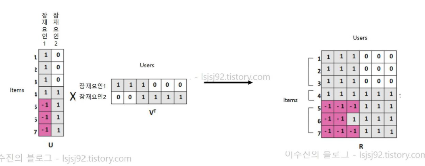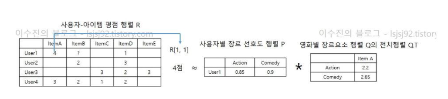 - 사용자-아이템 행렬을 -> '사용자-장르' + '장르-아이템' 이 두개로 분해한다.