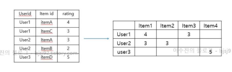 Nearest Neighbor 기반 협업 필터링에서는 사용자-item 행렬이 있어야 한다. 이 때 col은 item이며, row는 유저가 되어야 한다.