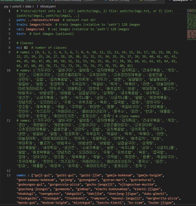 python train.py --img 640 --batch 8 --epochs 100 --data kfood.yaml --weights yolov5x6.pt --name batch_8_0.002_epoch_100_v5x6 --patience 5