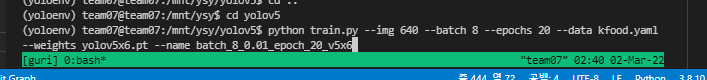 python train.py --img 640 --batch 8 --epochs 20 --data kfood.yaml --weights yolov5x6.pt --name batch_8_0.01_epoch_20_v5x6