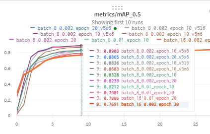 - batch 8 lr 0.002가 성능이 좋았으나 GPU메모리가 남아돌아서 batch 16 , lr 0.004로 바꿔 돌렸다.