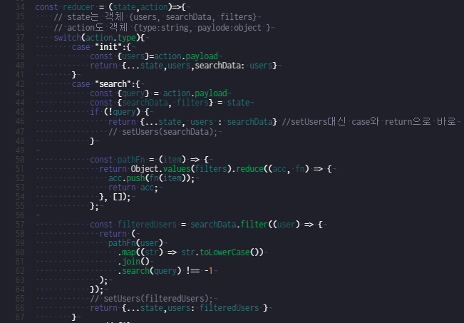 그리고 사용했던 여러 state들(users, searchData, query, filters) 들을 한번에 묶어서 initialState로 넘겨줘야 한다.