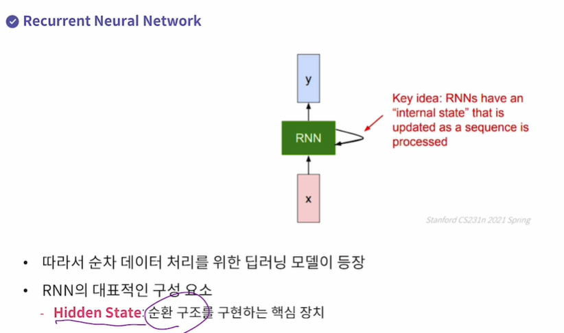 RNN은 Hidden State(=internal state)를 가지고 있다. 순환하는 internal state가 있다.