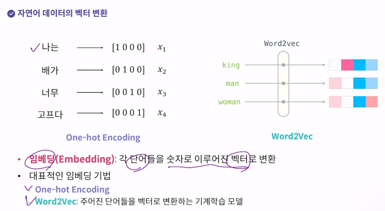 - 임베딩 : 각 단어들을 숫자로 이루어진 벡터로 변환