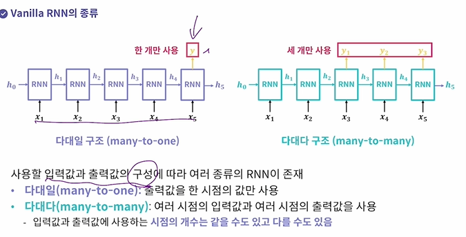 다대다: 여러 시점의 입력 -> 여러 시점의 출력값