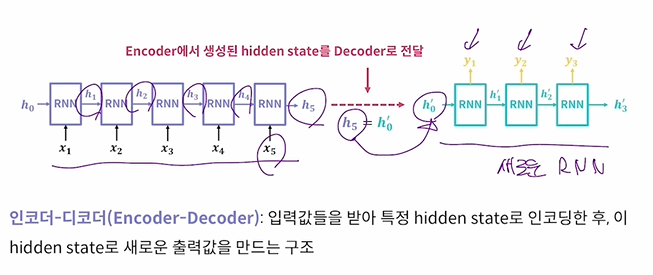 Encoder-Decoder 구조의 가장 큰 특징이라면 Encoder에서 나오는 출력값은 사용하지 않고, Encoder의 hidden state만 가져와서 이를 Decoder의 초기 hidden state로 활용한다는 점입니다.