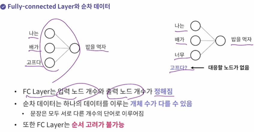 FC는 입력노드 개수와 출력노드 개수를 먼저 정해줘야 한다. 그러나 순차데이터는 하나의 데이터를 이루는 개체 수가 다를 수 있다. 또한 FC layer는 순서를 고려할 수 없다.(나는 배가 고프다, 배가 나는 고프다)