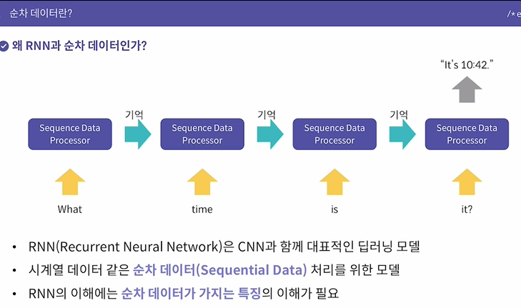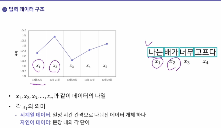- 순서가 있는 데이터. 이 단어 다음에 뭐가 올지 예상(ex 날씨 예보, DNA 염기서열, 샘플링된 소리신호)