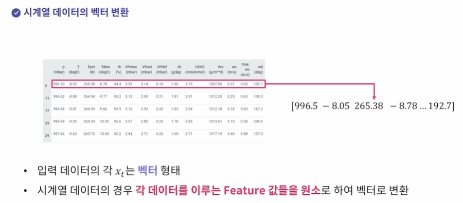 이미지 데이터는 픽셀 값을 행렬로 표현했다면, 시계열 데이터는 xt의 feature들(여기서 column)를 element로 해서 벡터 형태로 표현한다. x1 = [1,3,5,2,1] x2 = [3,2,1,1,1,]
