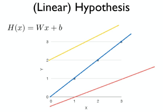 H(x) = Wx + b 일차 함수로 데이터를 표현하는 것, x와 y의 관계를 직선으로 유추하는 것. (x축 공부시간, y축 시험점수)