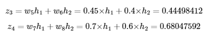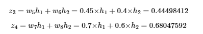 그리고 z3,z4를 또 구하게 된다. 이전 입력인 h1,h2에 w들을 곱하고 더해서 구한다