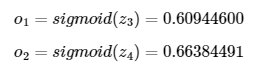 그럼 이제 출력층의 sigmoid를 거친 o1,o2가 나온다. 이 o1,o2는 드디어 pred가 된다.(정답과 비교할, loss에 쓰이는 값)