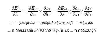 그럼 아까 Etotal의 w1에 대한 미분의 첫번쨰 부분(h1으로 미분하기)가 완성됨.